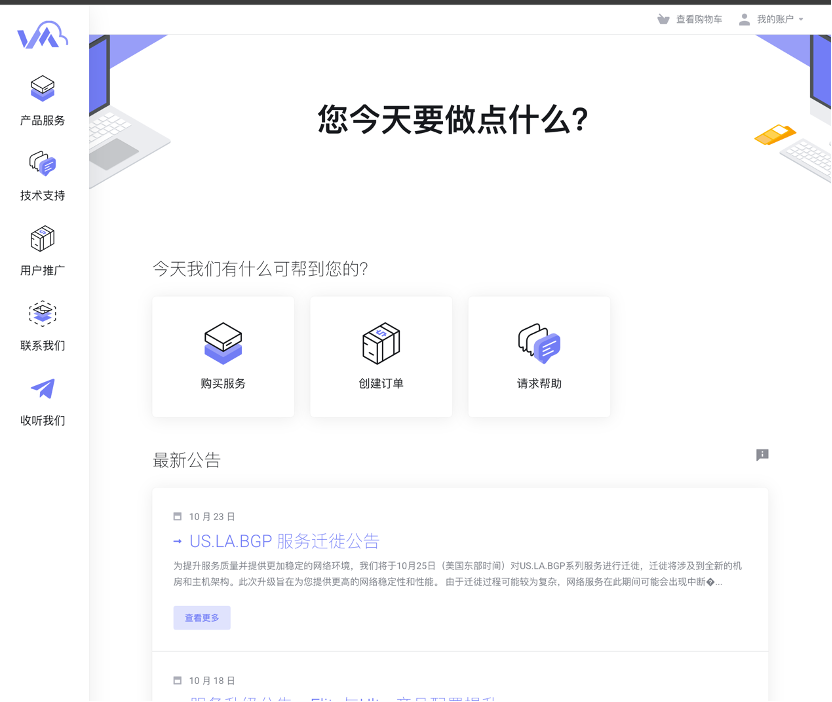 - 打开注册链接: 访问 VMiss 官网:https://app.vmiss.com/aff.php?aff=2029 在页面右上角找到并点击 我的账户,然后选择 注册账户。